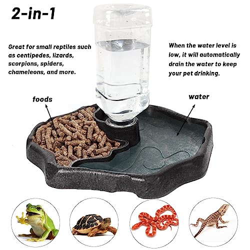 Ricarica Automatica Dell'Acqua -- Questa ciotola per l'alimentazione delle tartarughe rettili è dotata di una bottiglia per la conservazione dell'acqua. Dopo che il tuo animale domestico ha bevuto acqua, l'acqua nella bottiglia di stoccaggio dell'acqua verrà riempita automaticamente nel bacino dell'acqua. Nostri distributori d'acqua per terrari forniscono ai tuoi animali domestici acqua pulita in modo permanente per garantire la loro fornitura di acqua potabile.