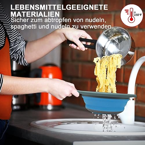 Walfos Scolapasta Pieghevole con Manico, Set di 2 pezzi da 20 e 24 cm Cucina Pieghevole sopra Il Lavandino del Silicone Colander/Setacci, scolapasta silicone Lavabili in Lavastoviglie, Blu