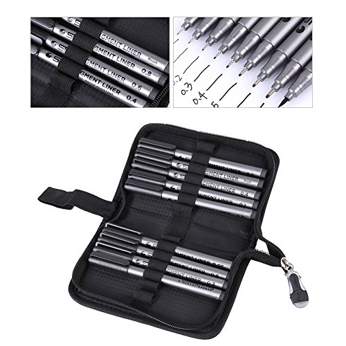 Walfront 9Pz Nero Pigment Liner Impermeabile Micro-Penna di Linea della Pittura 0,05/0,1/0,2/0,3/0,4/0,5/0,6/0,8mm + Pennello con Portapenne Sacchetto della Penna