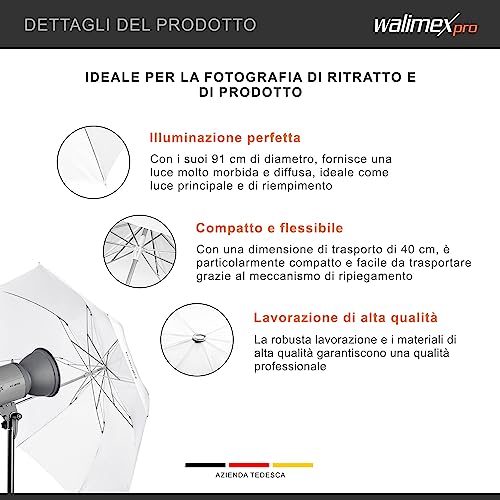 Walimex Pro Mini Ombrello traslucido 91 cm (pieghevole, dimensioni di trasporto ca. 40 cm, borsa per il trasporto inclusa)