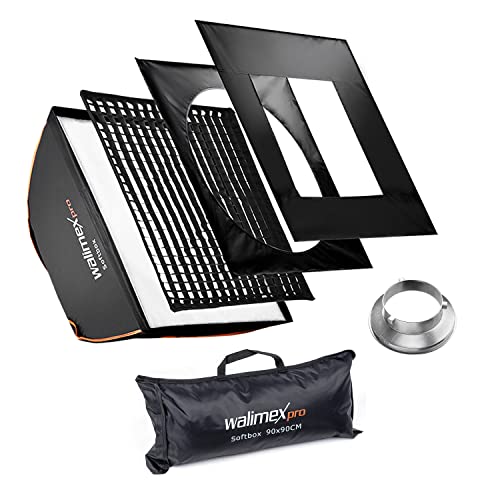 Include: 1 x Walimex Pro Softbox Plus OL 90 x 90 cm Aurora/Bowens Softbox adattatore incl. softbox, aste, diffusore posteriore, diffusore anteriore, maschera rotonda, maschera quadrata, griglia e borsa di trasporto