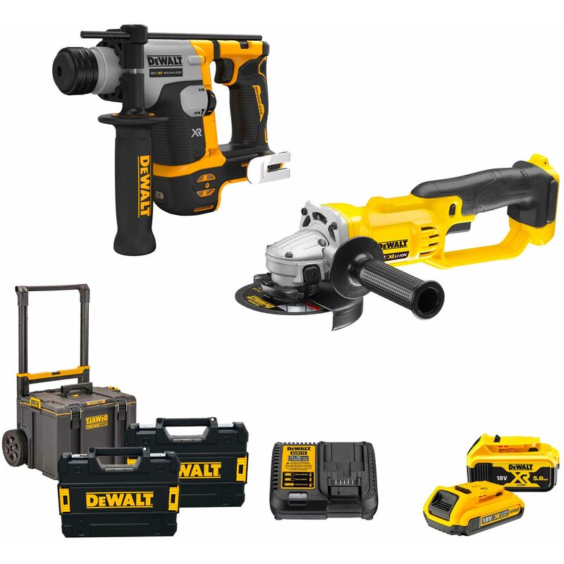 Kit Elettroutensili Dewalt DCK172DCG2-IT + trolley DWST83295-1, a batteria da 18V ideato appositamente per il professionista alla ricerca di un set di strumenti per il lavoro intensivo in cantiere. Il set esclusivo è composto dal nuovo tassellatore a batteria DCH172 e la smerigliatrice angolare DCG412 da 125 mm in grado di accogliere batterie da 18V. SPECIFICHE TECNICHE TASSELLATORE DCH172 Larghezza del prodotto 73 mm Controllo della rotazione No Velocità senza carico (RPM) 1060 Peso del prodotto 1.8 Kg Altezza prodotto 176 mm Fonte di alimentazione Cordless Mandrino a cambio rapido No Scheggiatura Sì Max. Capacità di perforazione (legno) 16 mm Lunghezza del prodotto 265 mm Controllo delle vibrazioni si SPECIFICHE TECNICHE SMERIGLIATRICE DCG412 Velocità a vuoto 7000 giri/min Max. diametro del disco 125 mm Filetto dell'alberino M14 Peso 2.2 kg Lunghezza 400 mm Altezza 125 mm Vibrazioni mano/braccio - smerigliatura 6.0 m/s² Incertezza (vibrazioni) 1.5 m/s² Pressione acustica 87 dB(A)