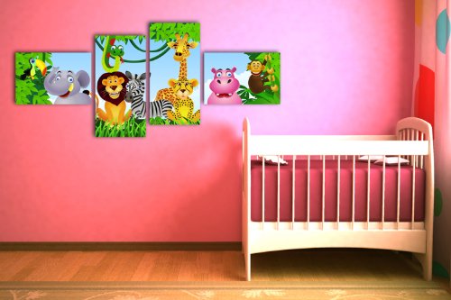 Wandmotiv24, quadro da parete, LW404, tela in 4 parti, 100 x 45 cm, stampa su tela, immagine XXL, telaio in legno, motivo: foresta, animali, bambini