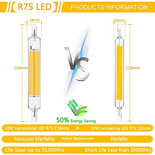 【Risparmio energetico del 95% 】Lampadine led R7s 118mm da 10W sostituisce le Lampadine Alogene da 100W-150W, Risparmiando fino al 95% sulle bollette elettriche, e ha un'eccellente conduttività termica, che può estendere la durata del servizio, Lunga durata di servizio di 30.000 ore, I bassi costi di manutenzione possono ridurre il problema delle frequenti sostituzioni della lampada.