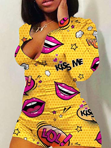 WangsCanis Tuta da Donna Pagliaccetti a Maniche Lunghe Scollo a V Tuta Corta Camicia da Notte Pipistrello Vita Alta Tuta Pantaloni Corti Body per Labbra Bodycon Sleepwear (G, M)