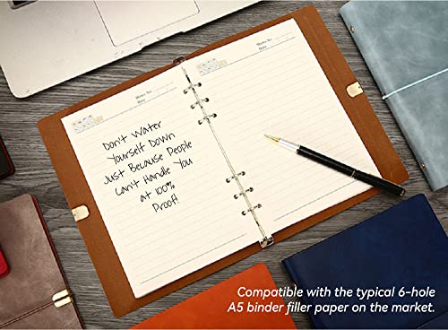Notebook ricaricabile: Questo notebook a 6 anelli è dotato di 80/160 pagine ed è compatibile con la tipica carta riempitrice A5 a 6 fori sul mercato. Quando hai finito di usare le pagine, acquista semplicemente la carta riempitiva per leganti A5 a 6 fori per ricaricarla e usarlo di nuovo.