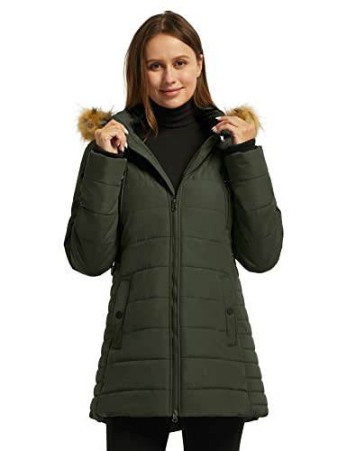 Wantdo Cappotto Caldo Invernale Giacca Media Lunga Antivento Parka con Cappuccio Staccabile in Pelliccia Giubbotto Slim Fit Idrorepellente Donna Verde Militare M