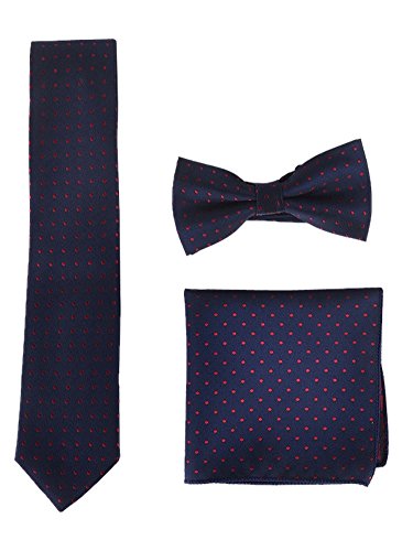 WANYING Uomo Gentleman Papillon Classico 6*12 cm & Cravatta Stretta 6 cm & Fazzoletto da Taschino 3 in 1 Set - A Pois Rosso Blu Scuro