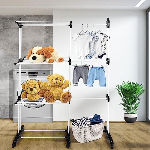 Asciugatura in piano: senza pieghe e ad asciugatura rapida (i vestiti possono essere stesi in piano sul ripiano per evitare problemi di allungamento e danni da pieghe e stropicciamento). Asciugabiancheria da interno a 3 livelli con una superficie di asciugatura molto ampia e una distanza ragionevole tra ogni asta di asciugatura per garantire che anche appesi pieni di vestiti, non si incastrino tra loro.