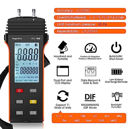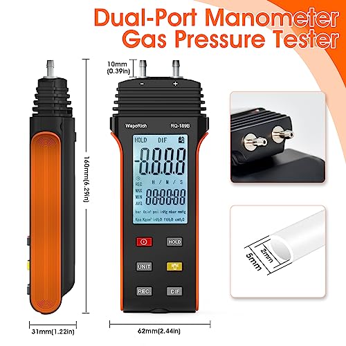 WapoRic Manometro Differenziale,Manometro di pressione differenziale dell'aria professionale a due porte,Manometro gas pressure tester differenziale HVAC Air Pressure Meter with backlight Data RQ-189B