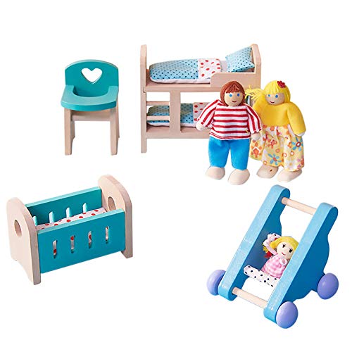 Washranp Mobili per Casa delle Bambole in Legno Set per Cameretta Modelli in Miniatura Giocattoli Assemblati Fai da Te con Sedia Letto Passeggino Mobili per Casa delle Bambole in Legno