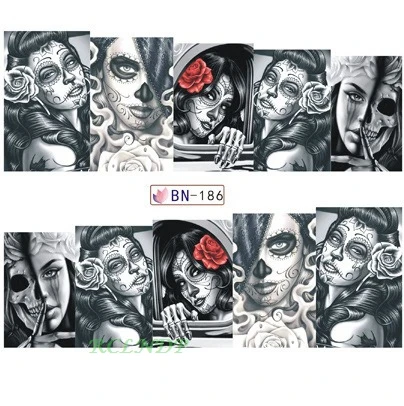 Water sticker for nail art decoration slider skull witch with rose flower watercolor ink design decal lacquer accessoires