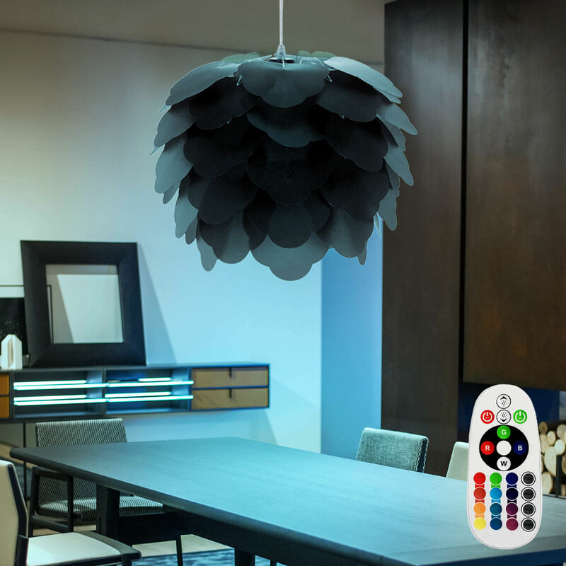 DescrizioneModerna, elegante e innovativa, questa lampada a sospensione ultramoderna accoglie ogni mente.Questa lampada in acciaio con un paralume color antracite, che deve essere assemblata da solo, fornisce quel qualcosa in più.L'RGB Imposta le lampadine in 15 colori diversi e assicura così un'illuminazione d'atmosfera. Un vero colpo d'occhio!Rispetto alle luci 'normali', i faretti a LED consumano solo una minima quantità di elettricità e hanno un consumo persino inferiore rispetto a quelli a risparmio energetico luci. Questo protegge l'ambiente e il tuo portafoglio. Una lampada LED di alta qualità da 7 watt a risparmio energetico con telecomando per luce bianca e controllo RGB è inclusa nella fornitura.Dettagli lampada • tipo di lampada: lampada a sospensione • materiale: acciaio • paralume: plastica antracite (da assemblare) • Dimensioni DxH in cm: 42.0x110.0 • Peso: 1239g• Montatura: 1x E27 • lampadine incluse: si • lampadine elettriche: 1x 7 watt • flusso luminoso: 470 lumen