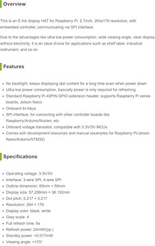 This is an E-Ink display HAT for Raspberry Pi, 2.7inch, 264x176 resolution, with embedded controller, communicating via SPI interface.