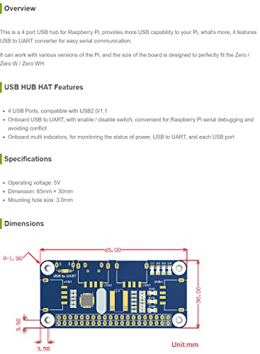 Waveshare - Hat Hub USB a 4 porte HAT compatibile con USB 2.0 1.1 per RPi Raspberry Pi Zero A + B B + 2 3 Modello B con convertitore integrato da USB a UART per Debug di serie