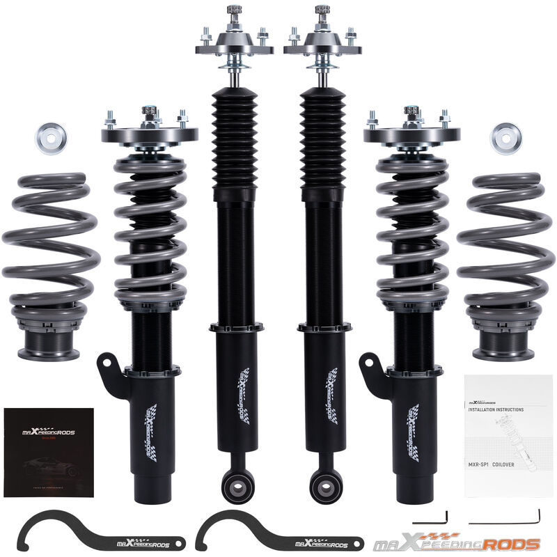 MaXpeedingrods SP2 coilovers are designed for daily street use and occassional track use. It features with racing damping oil, upgraded racing spring, full length height adjustable and adjustable camber plate( applicable for some vehicles), which offers you a lowered stance and enhanced handling. Application For BMW 3 E46 4-door sedan/Saloon 320i 325i 328i 330i 318d 320d 330d 02/1998-04/2005 For BMW 3 E46 2-door Convertible 323ci 325ci 330ci 320cd 330cd 04/2000-12/2007 For BMW 3 E46 2-door Coupe 320ci 325ci 330ci 320cd 330cd 02/1999-12/2006 For BMW 3 E46 Touring 5-door Wagon/Estate 316i 323i 325i 328i 330i 318d 320d 330d 10/1999-05/2005 Note: not for Xi/xd 4 wheel drive, not for M3 model either Specification Front top mounts: pillow ball top mount with camber plate Rear top mounts: pillow ball top mounts Damping: 24 levels rebound damping adjustable Spring rate Front: 9 kg/mm (504 lbs/in) Spring rate Rear: 11 kg/mm (616 lbs/in) Spring length Front: 180mm Spring length Rear: 183mm