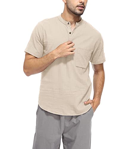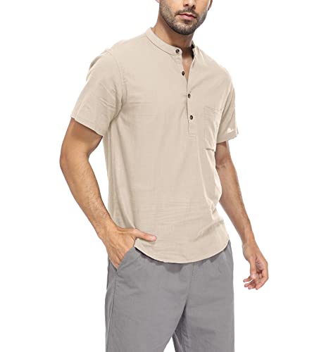 WAZZAP Uomo Camicia Lino di Cotone Henley Shirts con Bottoni Estate Casual Manica Corta Spiaggia Hippie Shirts