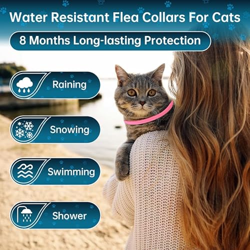 REGOLABILE E RESISTENTE ALL'ACQUA: Il collare antipulci e zecche per gatti è progettato per essere regolabile, consentendoti di personalizzare una taglia adatta alla dimensione del collo del tuo gatto. Questo collare antiparassitario per gatti è resistente all'acqua, permettendo al tuo gatto di godersi l'aria aperta senza compromettere la protezione dalle pulci. Rimane efficace anche in condizioni umide come pioggia o nuoto.
