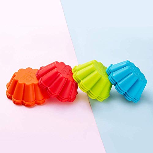 Confezione da 12 custodie per muffin: ogni tazza misura 7,62 cm superiore, 5,08 cm inferiore e 2,84 cm profondità. Confezione da 12 tazze rotonde in silicone confezionate in ogni set, inclusi quattro colori (arancione/rosso/verde/blu).