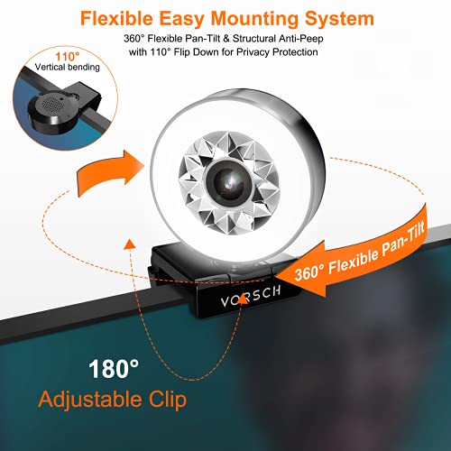 Tocca la Luce Regolabile a 3 Livelli-VORSCH webcam per pc ha una luce ad anello incorporata con un sensibile touchpad, 3 diversi livelli di luminosità regolabili continuamente toccando, in modo da poter ottenere varie condizioni di luminosità ideali in ambienti scarsamente illuminati.Messa a fuoco automatica rapida e accurata,per fornire la migliore posizione di messa a fuoco,per garantire l'alta qualità delle immagini video,in modo che la webcam pc con microfono possa catturare più dettagli.