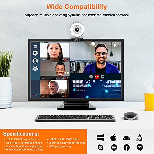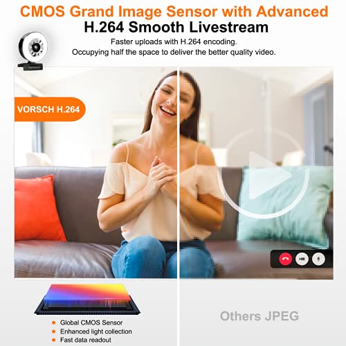 Webcam 1080P con Eccellente Chip Sensore CMOS-VORSCH 1932*1088 videocamera per pc utilizza un chip sensore di immagine di alta qualità da 1/2,7 "CMOS da 2 milioni di pixel,webcam streaming con più lenti in vetro ottico HD per fornire video Full HD e precisione del colore a 30 fotogrammi al secondo.La codifica H.264 avanzata comprime un file video digitale in modo che occupi solo la metà dello spazio di MPEG per fornire video di migliore qualità e velocità di maggiore velocità di trasmissione.