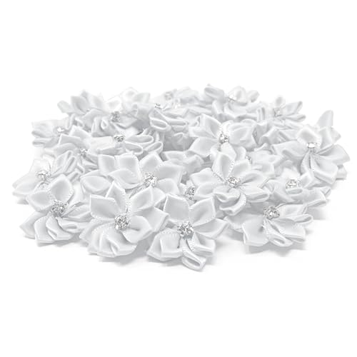 Wedding Touches - Nastro satinato, 25 mm, con fiori finti e diamanti centrale, colore: Bianco, Tessuto, bianco, 25-30mm
