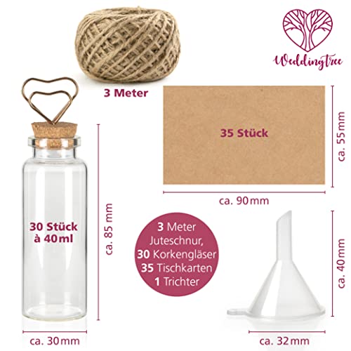 TUTTO COMPRESO NEL SET - Portaconfetti vetro con provette, completo con 35 segnaposto, ciascuno di 90 x 55 mm, 30 tappi di sughero, 30 portabiglietti, 1 imbuto per riempire, 5 m di cordoncino