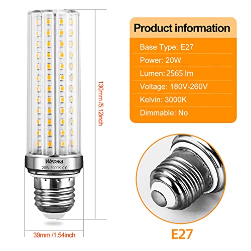 WEDNA Lampadine LED E27 20W, Bianco Caldo 3000K, Equivalenti a 150W, 2565 lm, Alta Luminosità Lampadina Mais E27, Non Dimmerabile, Confezione da 4