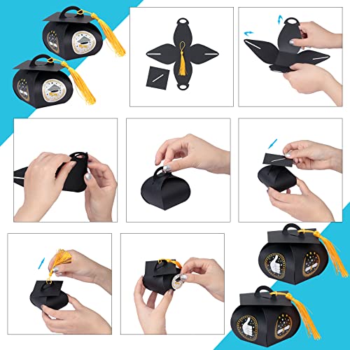 Confezione Regalo con Cappello di Laurea Nero: La confezione regalo che riceverai contiene un totale di 24 scatole regalo a forma di cappello di laurea, un adesivo con 4 stili diversi e 24 pon pon di laurea dorati. Ci sono abbastanza set regalo di laurea per soddisfare le tue esigenze.