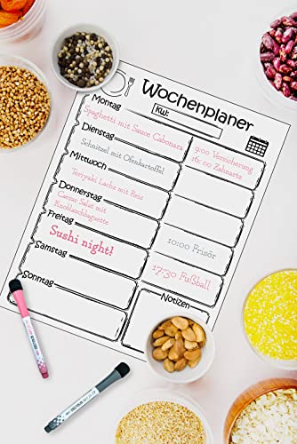 La planner settimanale è in tedesco. La confezione include tre pennarelli magnetici colorati cancellabili a secco (punta piccola), colore nero, rosso, blu. ★ La piccola spugna è pensata per la correzione poco dopo la scrittura. ★ ★