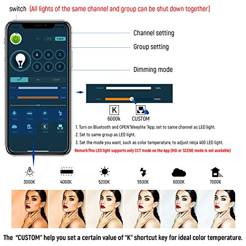 【Telecomando & Mobile APP Supporto】 La luce video è dotata di un telecomando standard che in grado di controllare le luci all'interno di 6 gruppi e 19 canali tramite il sistema Bluetooth a 2,4 GHz, offrirà operazioni più efficienti per le tue riprese fotografiche. Supporta anche la regolazione della regolazione tramite APP mobile e DMX per una regolazione della temperatura più comoda.