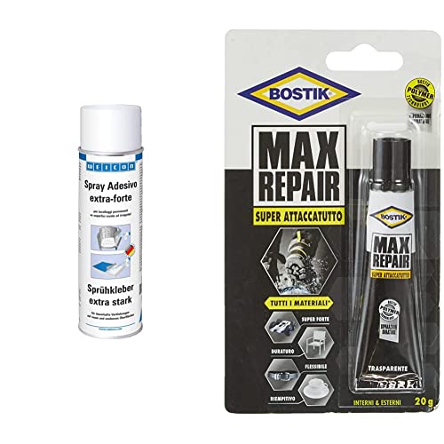 WEICON Colla Spray extraforte 500 ml di adesivo universale per un forte legame & Bostik MAX REPAIR adesivo di riparazione super forte, flessibile, per incollaggi estremi g 20, Trasparente