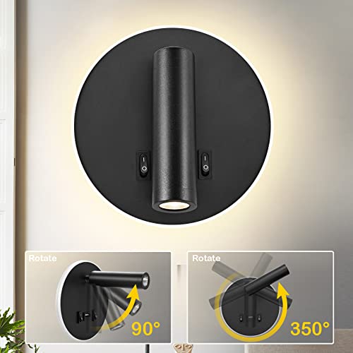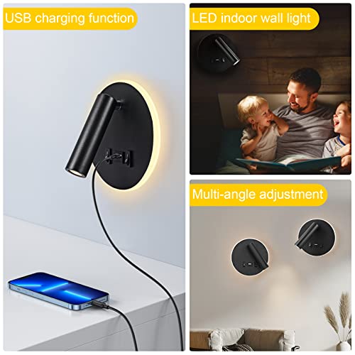 Weigudoc Lampada da Parete a LED con Porta di Ricarica USB, Lampada da Lettura da Comodino Orientabile, Applique da Comodino (3W 3000K+9W 3000K) per camera da letto Comodino Soggiorno Studio(1 nero)