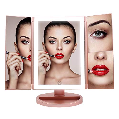 WEILY Specchio per il trucco con luce 1x / 2x / 3x Trifold ingrandente con 36 LED Touch Screen Luci e ricarica USB, Supporto regolabile a 180 gradi per specchio cosmetico per il trucco - oro rosa