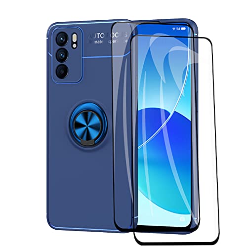 WEIOU Cover per Oppo Reno 6 5G (Reno6 5G) + 2 Vetro Temperato, Protezione Antiurto TPU Silicone Cover Avave Anello Rotazione di 360° Gradi, Morbida Bumper Case, Blu+Blu