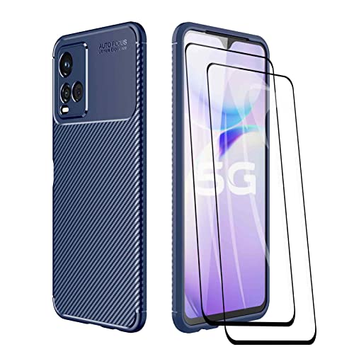 WEIOU Fibra di Carbonio Cover per Vivo Y21 / Y21s / Y33s Case + 2 Vetro Temperato, Custodia in Morbida Silicone TPU Anti-Graffio Antiurto Protettiva Shell Bumper. Blu
