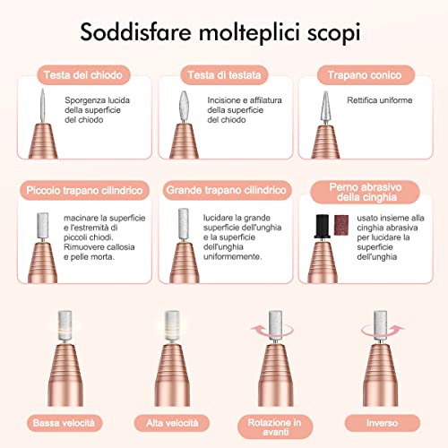 【Velocità e direzione regolabili】 Con il pulsante di controllo della velocità, è possibile regolare la velocità della lima per unghie elettrica da 0 a 20.000 RPM, rendendo facile la lucidatura delle unghie. L'interruttore flessibile avanti/indietro è adatto sia per mancini che per destrimani, rendendo facile l'utilizzo del trapano per unghie. Rimuove facilmente la vernice senza danneggiare l'unghia.