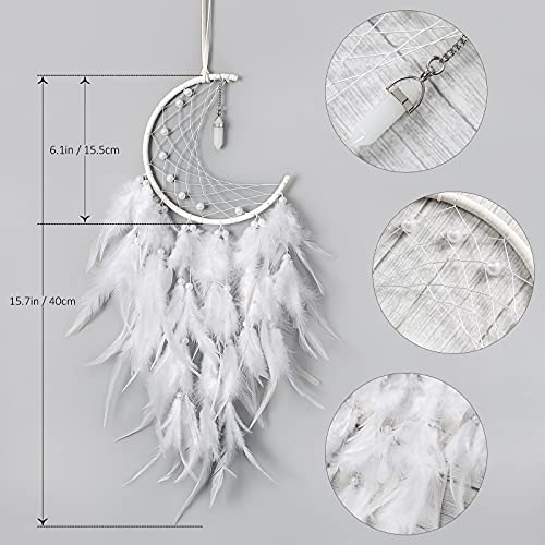 Weldomcor Acchiappasogni Fatto a Mano Con Piuma E Luna Acchiappasogni Acchiappasogni da Parete Con Ciondolo in Pietra Stile BohéMien Decorazione per la Camera dei Bambini, Bianco