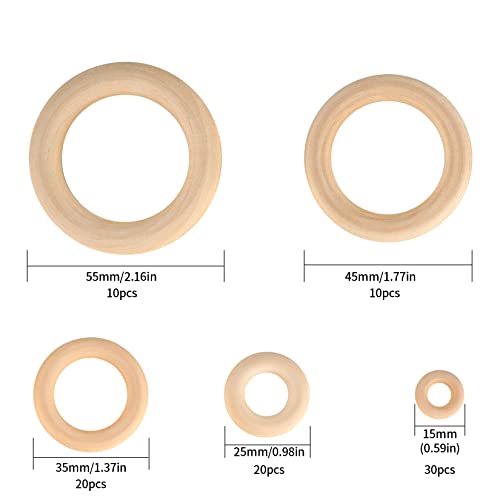 WELHAEPI 90 Pezzi Anelli in Legno Naturale, Anello in Legno, Cerchio in Legno per Decorazioni Artigianato, Creazione Gioielli, Connettori Pendenti Fai da Te ad Anello - 15mm, 25mm, 35mm, 45mm, 55mm