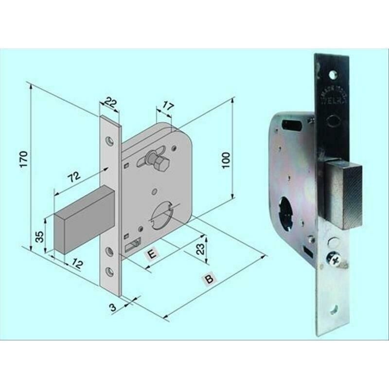 Per cancelli e porte in ferro, scrocco una mandata e mezza, pomolino svitabile. Lunghezza catenaccio 72 mm. Cilindro non in dotazione.
