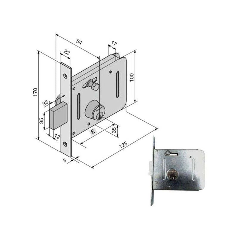 Serratura cancelli/porte ferro infilare Acciaio zincato tropicalizzato 1 mandata e mezza - Scrocco - Pomolino svitabile Scatola mm 125x100 - Frontalemm 22x170 ENtrata mm 50 - Cilindro serie 605.00.00.1