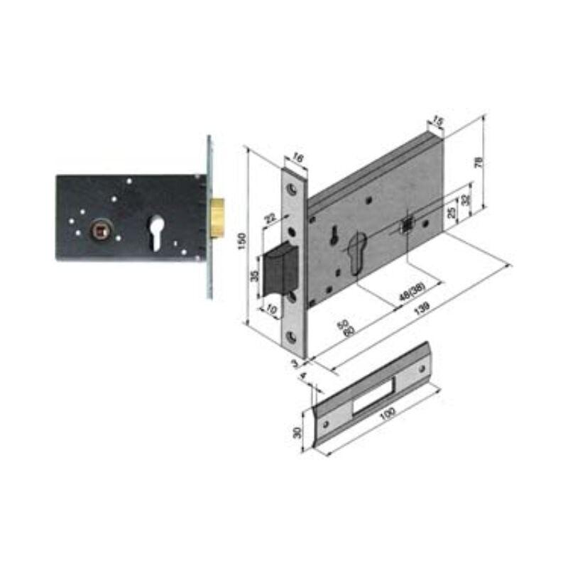 Mm.50 (12150010) per montante a fascia, scatola in acciaio zincato bianco, frontale ed incontro da mm.16 in acciaio zincato bianco, incontro mm.30x100 - catenaccio a 1 mandata con scrocco reversibile incorporato e richiamo tramite chiave o quadro maniglia da mm.8 passante, utilizzabile cilindro sagomato tipo europeo non compreso, scatola mm.78h. Categoria merceologica: Serrature, chiusure di sicurezza e accessori - Sicurezza - Serrature per fasce da infilare