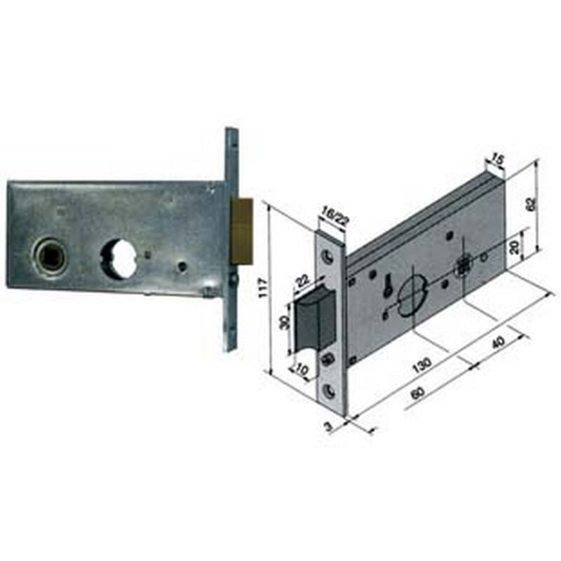 Per montante a fascia, scatola in acciaio zincato, frontale ed incontro da mm.16 in acciaio zincato, incontro mm.30x100 - catenaccio a 1 mandata con scrocco reversibile incorporato con richiamo tramite chiave o quadro maniglia da mm.8 passante, utilizzabi