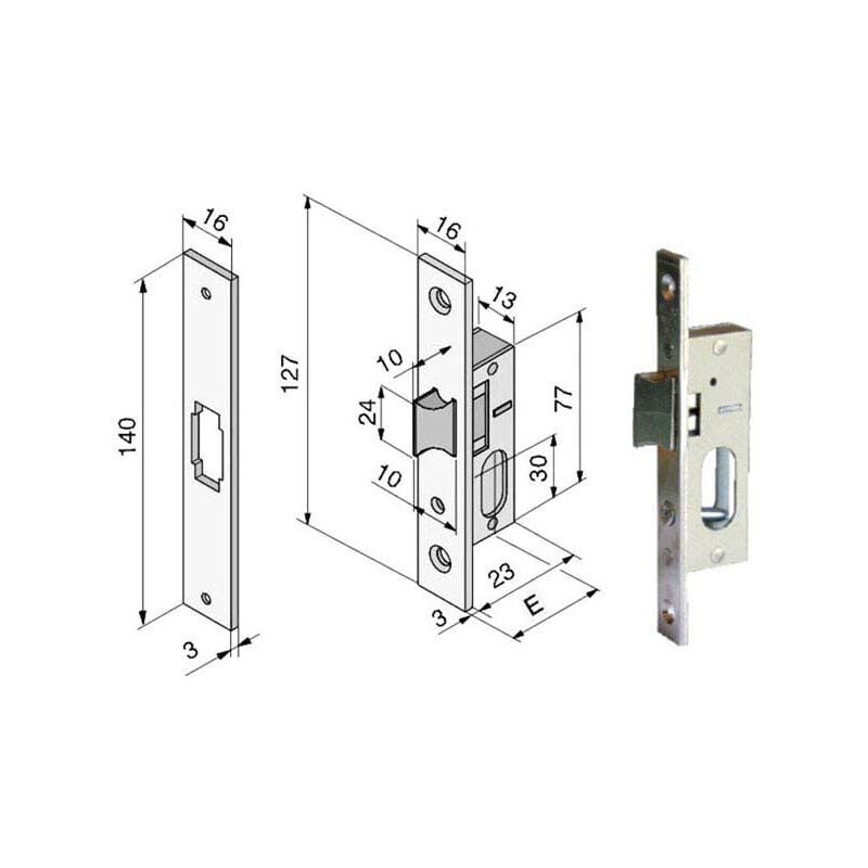 Serratura montanti alluminio infilare Acciaio nichelato - Incontro Scrocco reversibile Scatola mm 23x77 - Frontale mm 16x127 ENtrata mm 15 - Cilindroserie 702 non incluso