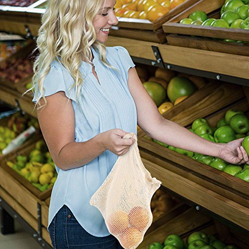 3. Buona qualità: le borse in mesh di alta qualità con pesi sono trattate in modo stabile. Le cuciture sono doppie ed estremamente resistenti. Con un forte legame, non perderai sicuramente frutta e verdura.