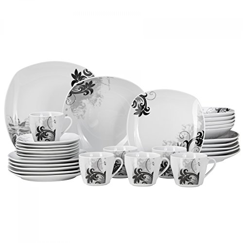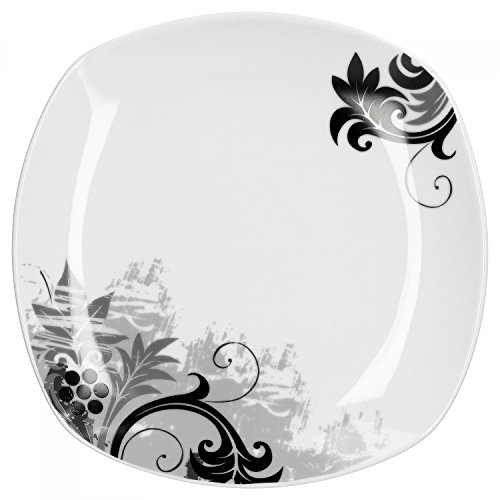 Van Well - Servizio da tavola combinato, in porcellana, a forma quadrata, 60 pezzi, per 12 persone, con motivo floreale nero, colore: Bianco