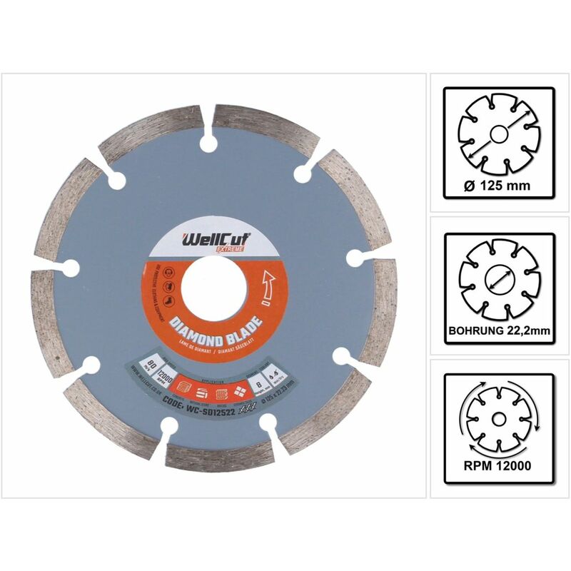 Dotazione: - 1x WellCut Diamond Blade Disco da taglio diamantato 125 x 22,23 mm ( WC-SD12522 ) Descrizione prodotto: Il disco da taglio diamantato di alta qualità WellCut convince per la sua lunga durata e le sue prestazioni particolarmente elevate. È adatto per un lavoro preciso e può essere usato universalmente in una vasta gamma di materiali da costruzione come calcestruzzo, granito, pietra naturale, mattoni e ceramica. Dati tecnici: Produttore: WellCut Produttore: WC-SD12522 Diametro: 125 mm Diametro del foro: 22,23 mm Velocità massima: 12000 giri/min Velocità di taglio: 80 m/s Spessore del segmento: 8 mm
