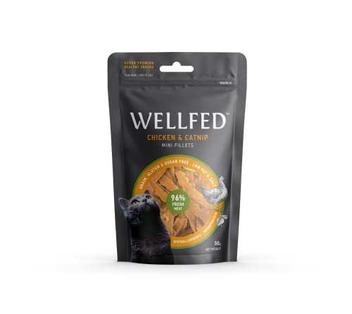 Wellfed - Mini filetti per polli + Cat NIP -Rich in proteine confezione da 6 (6 x 50 g), snack sani - 94% Fresh Meat - Sugar Free