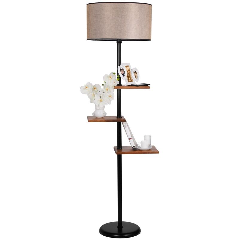 Lampada da pavimento Colore nero Struttura metallica Schermo in tessuto Scaffali in legno Altezza dello schermo: 24 cm Schermata del diametro: 45 cm Diametro del piede: 30 cm Altezza totale: 163 cm Scaffi: 30 x 23 cm Scaffi: 26 x 19 cm Scaffale: 25 x 16 cm Interruttore di onda/spegnimento nel cavo Vernice secca al forno elettrostatico Tipo di discussione: E 27 Max 60 W Tensione massima: 220-240 V.