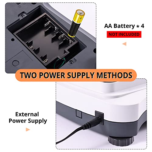 【2 modi di alimentazione】 Questa bilancia elettronica ha 2 modi di alimentazione: 4 batterie a secco AA (non incluse) o collegate. Nota: se si desidera utilizzarla collegandola, in primo luogo, si prega di spegnere l'interruttore nero sul fondo della bilancia da laboratorio per interrompere l'alimentazione della batteria (premere il pulsante sul segno di blocco), OPPURE rimuovere semplicemente le batterie.